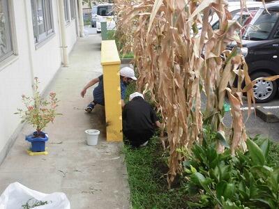【さくら学級】間もなく、ポップコーンづくりのために収穫を迎えるトウモロコシが植わっている花壇の草取りをしま