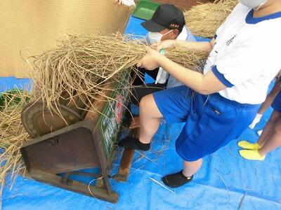 稲刈り鎌を使って刈り取りました。また、脱穀機を使って脱穀しました。児童は、お米