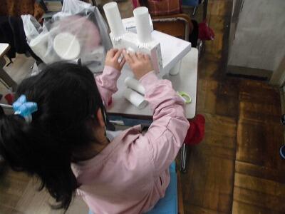 【1年生 図工】思い思いに箱を重ねて作品を仕上げています。もうすぐ完成です。