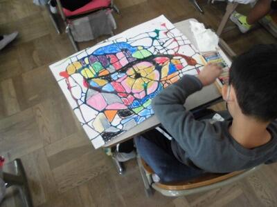 【2年生 図工】絵の具をたらした模様に色を塗ったり、絵を描いたりしています。