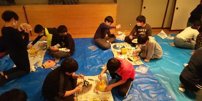 夕食の後はふくべ細工の体験学習です。職人さんの話を聞き、おもいおもいの絵を描きました。