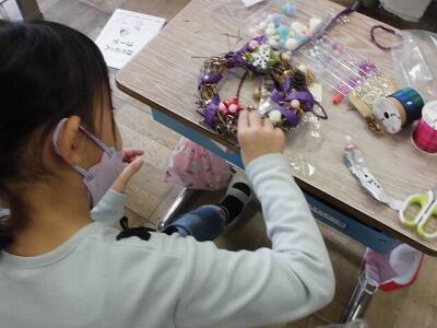 【1年生 図工】アサガオで作ったリースに飾り付けをしました。