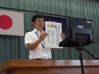 校長は、「思いやりの心をもとう」という話をしました。また、生徒指導主任が今月の生活目標「自分からあいさつをします」について話をしました。