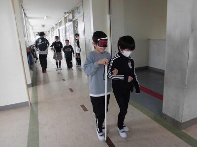 4年生が総合的な学習の時間に白杖体験を行いました。
