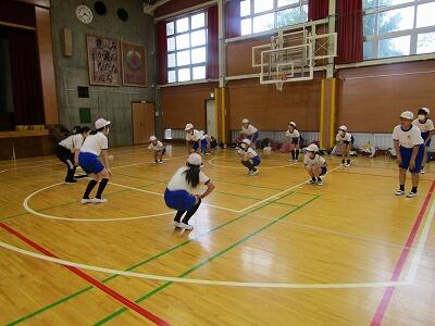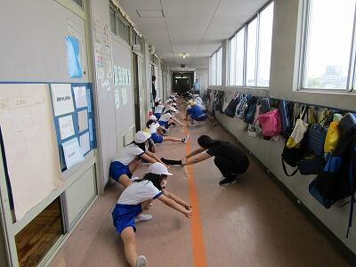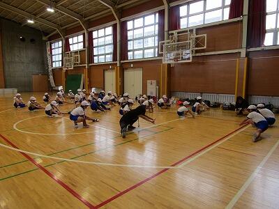 雨のため、体育館での全体指導の後、種目ごとに分かれて、柔軟運動と体力づくりを行いました。
