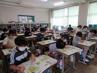 3年生がグリンピースのさやむき体験を行いました。一粒一粒ていねいにむいていました。