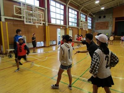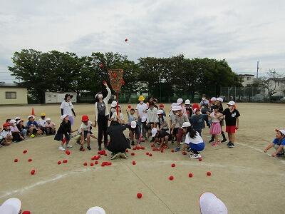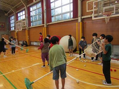 今日の友達タイムでは、計画委員会が企画した、1年生と6年生、2年生と5年生、3年生と4年生が仲良く手をつなぎ協力して玉入れを行う二人三脚玉入れを行いました。