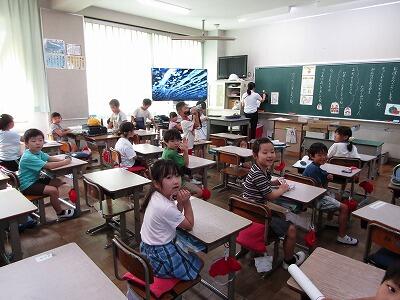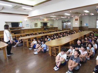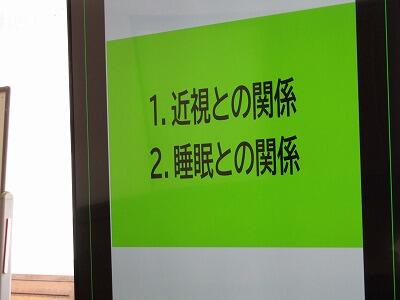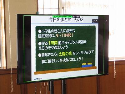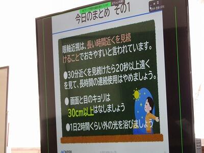 よい姿勢でモノとの距離は30㎝以上離して見ること、太陽光を浴びて近視を予防すること、そして、睡眠が大事とのお話でした。1日のデジタル機器の使用時間の目安を決める、30分デジタル機器を見続けたら、しばらく目を休めるなど、ご家庭でも使用ルールを決め、適切な使用をお願いします。