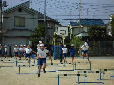 5年生は、ハードル走の練習です。タイミングよくまたぎ越す練習です。