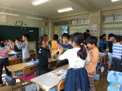 2年生が、曲に合わせて手拍子をしています。友達と合わせると、より楽しくなります。