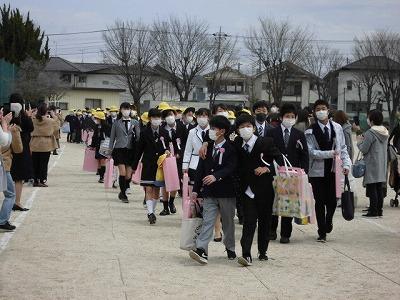 学級活動を終え、校庭で担任とお別れと旅立ちの退場を行いました。迎えにいらした保護者の方々と教職が拍手をして卒業生を見送りました。ご卒業おめでとうございます。