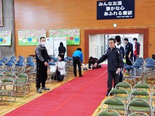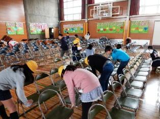 放課後の体育館では、在校生代表の5年生と先生方が会場の