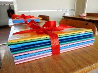 自主勉ノートに赤いリボンが掛けられ机の上に置いてありました。