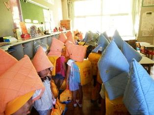 避難訓練を行いました。防災頭巾をかぶり、静かに落ち着いて