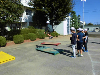 休み時間の校庭での様子です。鉄棒教室、なわとび、ドッチボール、竹馬など様々なことをして過ごしています。