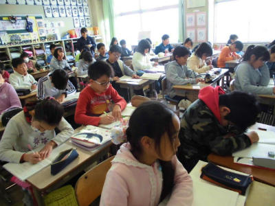 もぐもぐタイム…給食の時間の後半は黙って食べる時間があります。担任が読み聞かせをしています。