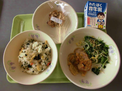 わかめごはん 牛乳 鶏肉の和風ピカタ 小松菜と水菜のごま和え