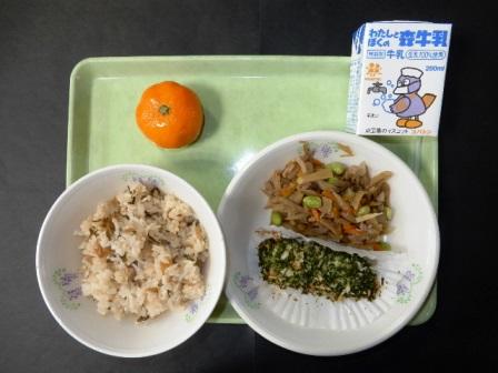 しゃくしなごはん、白身魚の磯焼き、カラフルきんぴら、冷凍みかん、牛乳です。