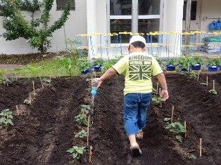 678組では、教室前の花壇を活用して野菜の苗を植え付け