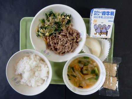 梨、牛乳です。旬の梨は、春日部内牧産のもので、とても美味しくいただきました。