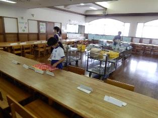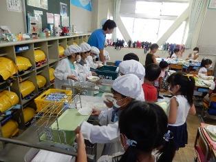 給食前には栄養士さんと給食担当の先生が準備をしています。