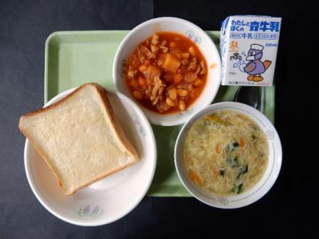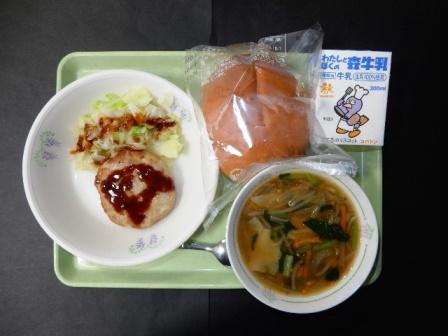 子どもパン、ハンバーグ、茹でキャベツ、ワンタンスープ、牛乳です。
