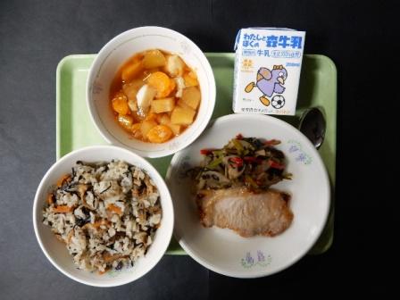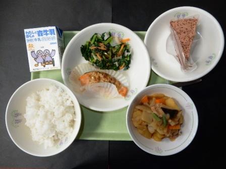 ごはん、鮭のごまマヨネーズ焼き、かんぴょうの和え物、肉じゃが、牛乳です。