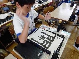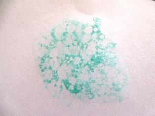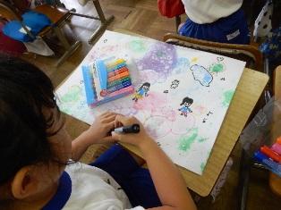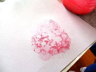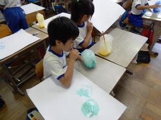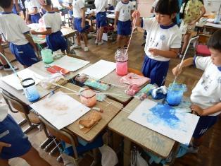 2年生は図工の授業で、絵の具を泡立てて画用紙に写して
