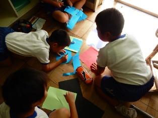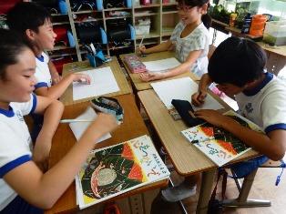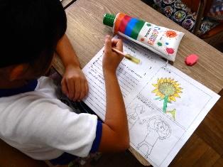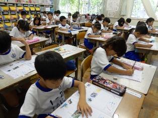 2年生は敬老会のメッセージカードを書いています。メッセージを