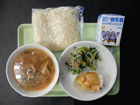 今日の給食は、子どもたちに人気のビビンバ(ごはん 具)、おこげ入り野菜たっぷりスープ、
