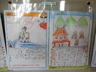 廊下の掲示板には、夏休みの絵日記が掲示されています。