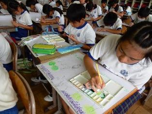 2年生は図工の授業で、「キラキラシャボンで」の作品を制作しています。
