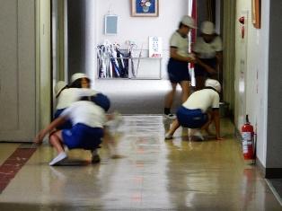 避難訓練を行いました。防災頭巾をかぶり、静かに落ち着いて