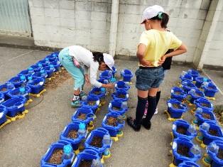 1年生がアサガオに水くれをしています。双葉が出てきたので、