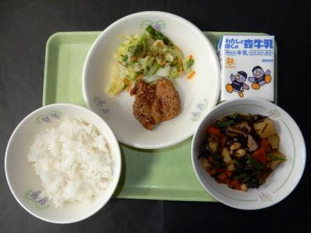 ごはん、牛肉のごまだれがけ、アスパラの狭山茶あえ、磯煮、牛乳です。
