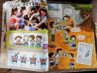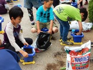 1年生は生活科の授業で、植木鉢に培養土を入れて水くれを