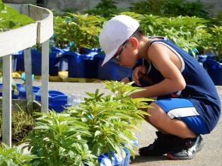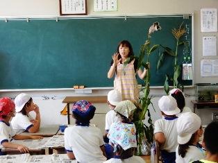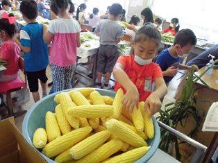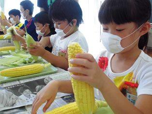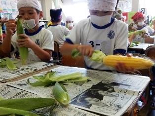 今日は、食育の一環で、3年生と678組の児童がトウモロコシの