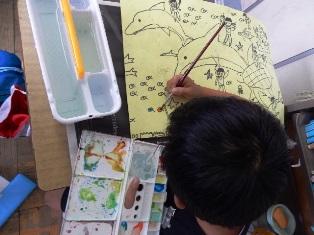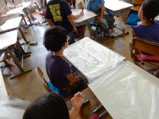 2年生は図工の授業で、画用紙の上にビニールを被せ、そこに