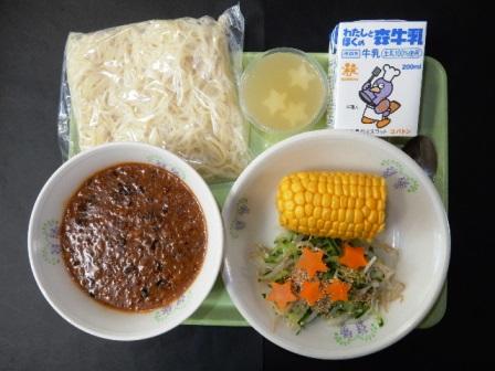 ジャージャー麺(中華麺、具)、蒸しとうもろこし、七夕ゼリー、牛乳です。