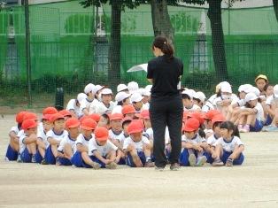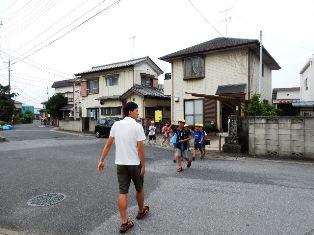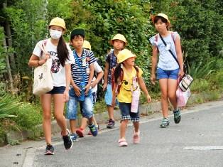 影を見ると日射しの強さが分かります。子供たちは暑さに負けず