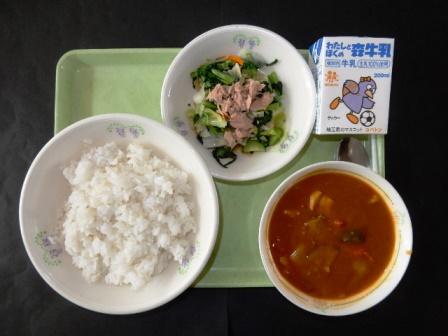 麦ごはん、夏野菜カレー、ツナサラダ、牛乳です。かぼちゃをはじめ、美味しい夏野菜が