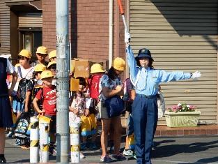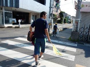 朝から夏の日射しが照りつけるなか、地域、交通指導員の