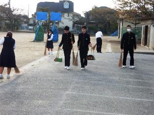 あいさつ運動の前に校庭の掃除をしています。ありがとうございました。