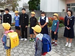 一緒にあいさつしている6年生は、半年で中学生ですね。