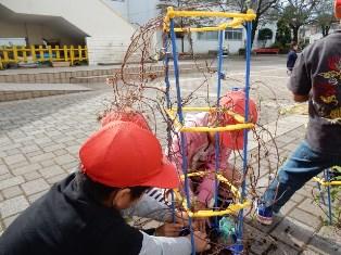 1年生は生活科の授業で、アサガオのつるを外しています。
