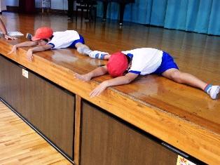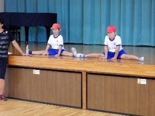 1年生は体育の授業で、柔軟体操をしています。二人はお手本です。