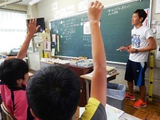 6年生は外国語活動で、ALTとJTEと担任の先生による授業です。