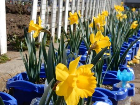 2年生が植え付けたスイセンの球根。こちらも、花が咲きそろってきました。