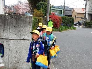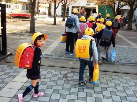 黄色いランドセルカバーを掛けて1年生が、初めての通学班での登校です。