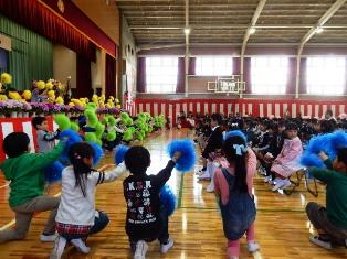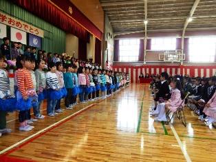 入学式に先立って2年生と6年生が歓迎の言葉と演技をしました。